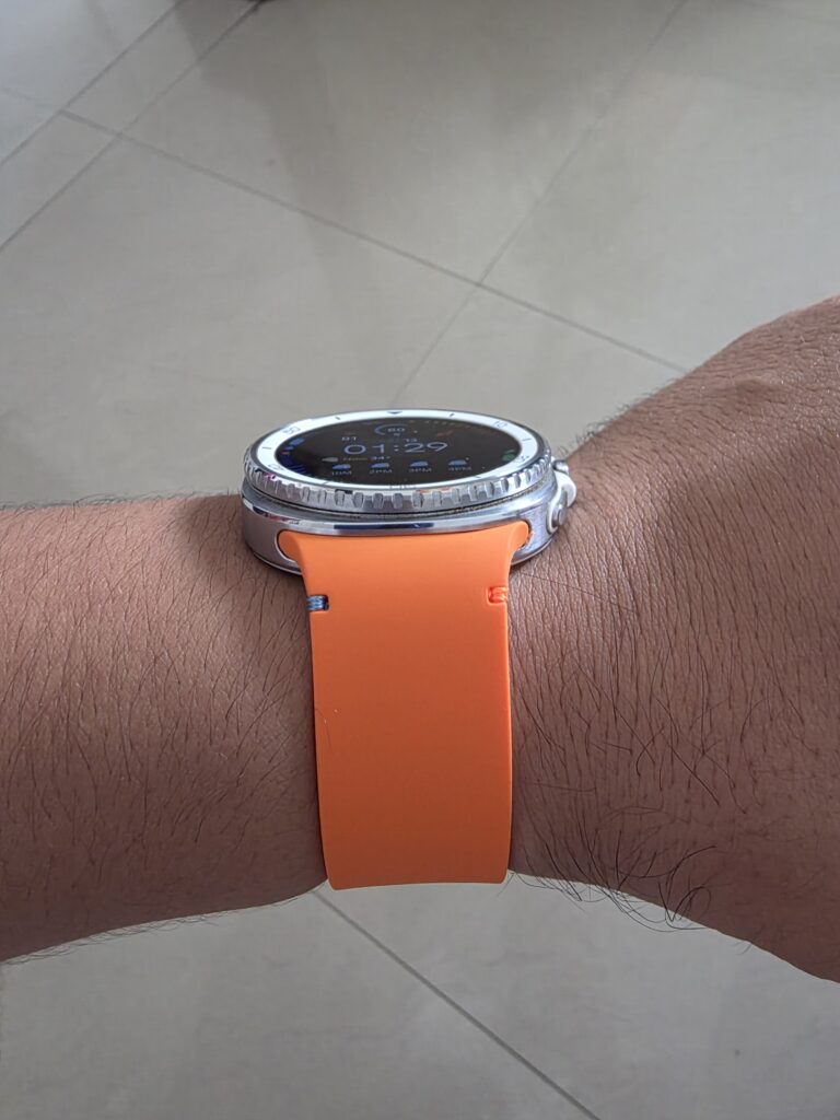 The first impression is the stitched design—it gives the band a classy, almost leather-like vibe while keeping the practicality of silicone. The strap feels flexible yet substantial; it doesn’t flop around or feel flimsy. The buckle is solid, and the keeper loop holds the tail neatly in place. Overall, it looks right at home on the Galaxy Watch 8 Classic’s rugged-premium case.